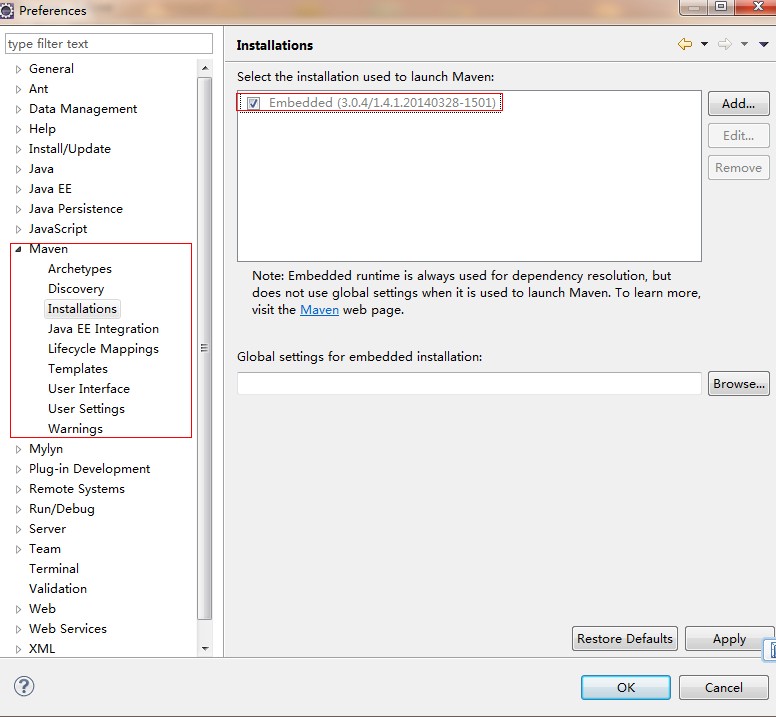 在最新的 Eclipse 中自带了 Maven,我们打开,Windows->Preferences,如果会出现下面的画面:
